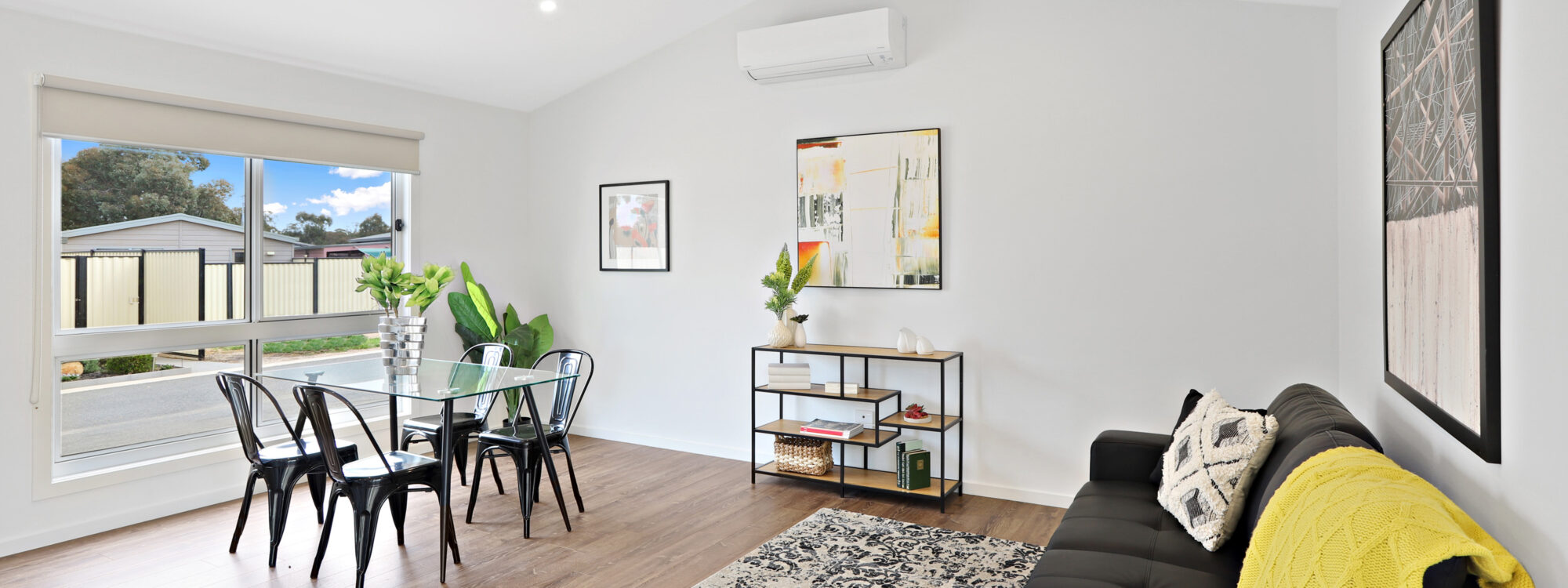 The light open plan living area in Unit 144 features a raked ceiling and a split system air conditioner. The kitchen includes a dishwasher and the dining area looks over the rear deck and garden.