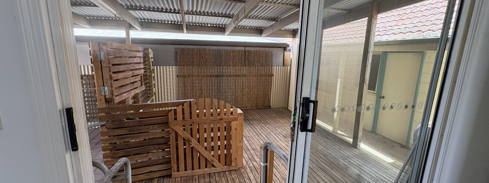 The private covered deck area offers a place to sit outside and can be securely closed off for a pet.